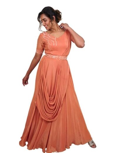 Avy's Label Cotton Crepe Jumpsuit Premium Rust Orange Crepe Jumpsuit with Pre Draped Georgette Dupatta and Maggam Work Belt_ (Rust Orange, 36)