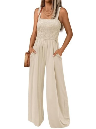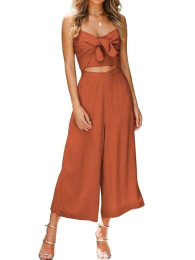 AVALEBETI Women's Summer Spaghetti Straps Tie Knot Cutout Smocked Shirred Back High Waist Wide Leg Jumpsuits Rompers Pockets