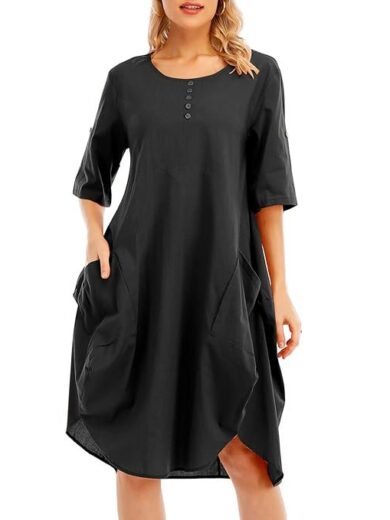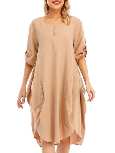 Belity Women Tunic Dress Roll-up Short Sleeve Comfortable Cotton Pockets Irregular Hem Solid Baggy Midi Dress